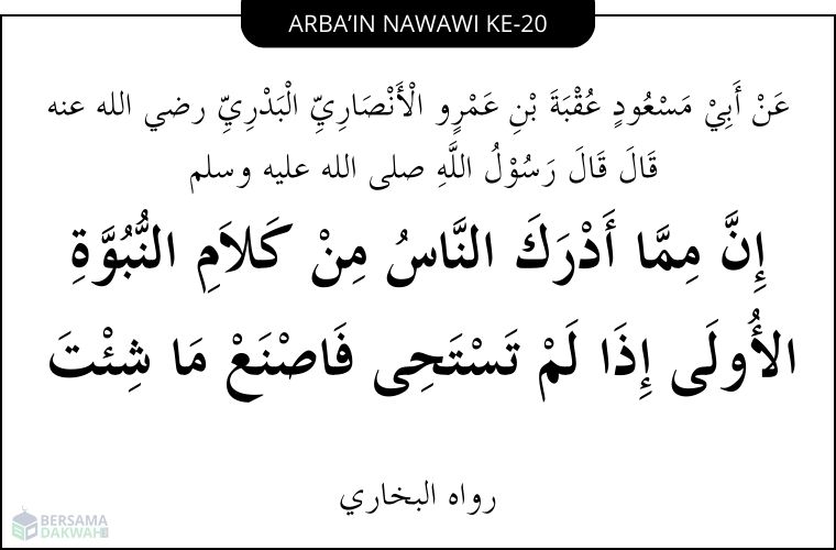 عَنْ أَبِيْ مَسْعُودٍ عُقْبَةَ بْنِ عَمْرٍو الْأَنْصَارِيِّ الْبَدْرِيِّ رضي الله عنه قَالَ قَالَ رَسُوْلُ اللَّهِ صلى الله عليه وسلم إِنَّ مِمَّا أَدْرَكَ النَّاسُ مِنْ كَلاَمِ النُّبُوَّةِ الأُولَى إِذَا لَمْ تَسْتَحِى فَاصْنَعْ مَا شِئْتَ. رواه البخاري