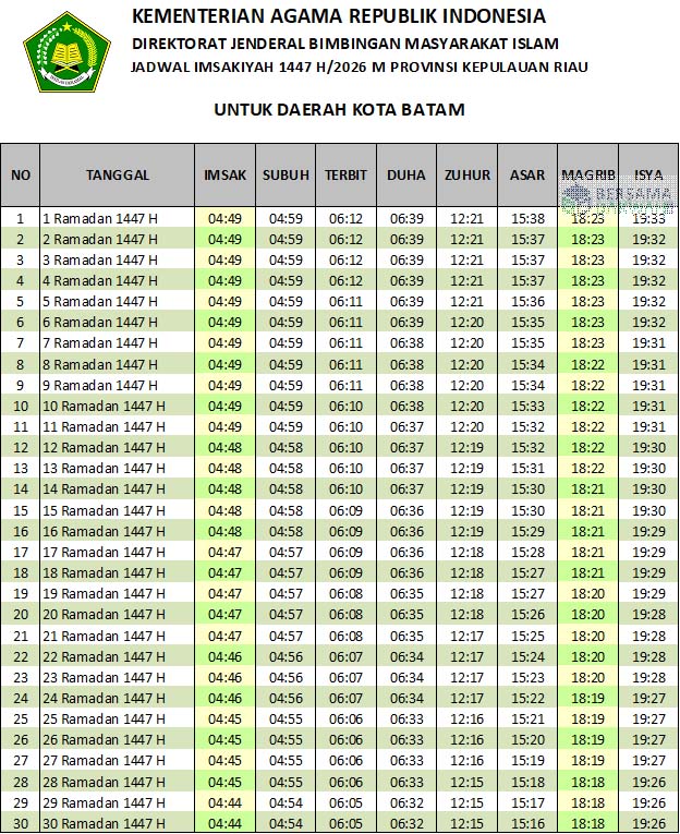 Jadwal imsakiyah Batam Ramadhan 2026 ini bersumber dari Website Bimas Islam milik Kementerian Agama Republik Indonesia. Untuk jadwal imsakiyah kota lainnya, bisa dibaca di Jadwal Imsakiyah Ramadhan 2026. Sedangkan yang ingin men-download atau menyimpan dalam bentuk foto, telah tersedia format jpg di atas.