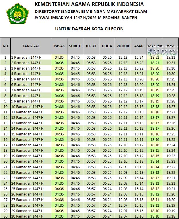 Jadwal imsakiyah Cilegon Ramadhan 2026 ini bersumber dari Website Bimas Islam milik Kementerian Agama Republik Indonesia. Untuk jadwal imsakiyah kota lainnya, bisa dibaca di Jadwal Imsakiyah Ramadhan 2026. Sedangkan yang ingin men-download atau menyimpan dalam bentuk foto, telah tersedia format jpg di atas.