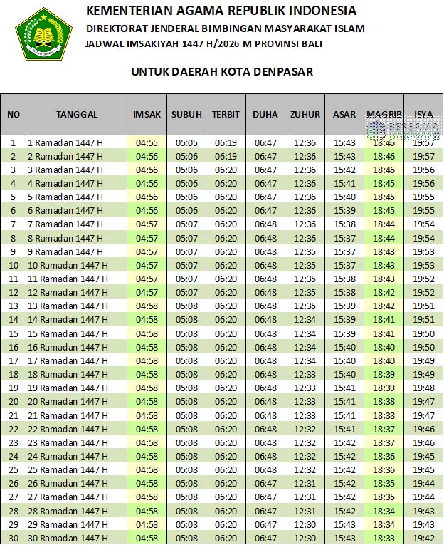 Jadwal imsakiyah Denpasar Ramadhan 2026 ini bersumber dari Website Bimas Islam milik Kementerian Agama Republik Indonesia. Untuk jadwal imsakiyah kota lainnya, bisa dibaca di Jadwal Imsakiyah Ramadhan 2026. Sedangkan yang ingin men-download atau menyimpan dalam bentuk foto, telah tersedia format jpg di atas.