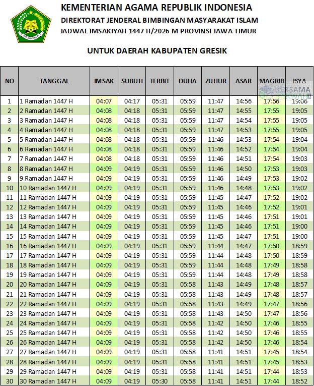 Jadwal imsakiyah Gresik Ramadhan 2026 ini bersumber dari Website Bimas Islam milik Kementerian Agama Republik Indonesia. Untuk jadwal imsakiyah kota lainnya, bisa dibaca di Jadwal Imsakiyah Ramadhan 2026. Sedangkan yang ingin men-download atau menyimpan dalam bentuk foto, telah tersedia format jpg di atas.