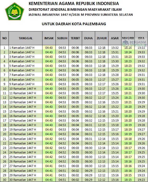 Jadwal imsakiyah Palembang Ramadhan 2026 ini bersumber dari Website Bimas Islam milik Kementerian Agama Republik Indonesia. Untuk jadwal imsakiyah kota lainnya, bisa dibaca di Jadwal Imsakiyah Ramadhan 2026. Sedangkan yang ingin men-download atau menyimpan dalam bentuk foto, telah tersedia format jpg di atas.