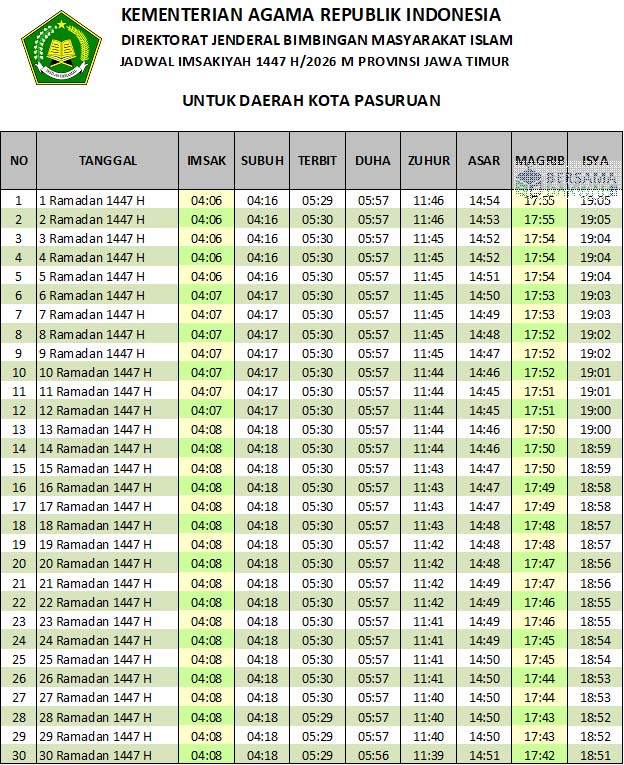 Jadwal imsakiyah Pasuruan Ramadhan 2026 ini bersumber dari Website Bimas Islam milik Kementerian Agama Republik Indonesia. Untuk jadwal imsakiyah kota lainnya, bisa dibaca di Jadwal Imsakiyah Ramadhan 2026. Sedangkan yang ingin men-download atau menyimpan dalam bentuk foto, telah tersedia format jpg di atas.