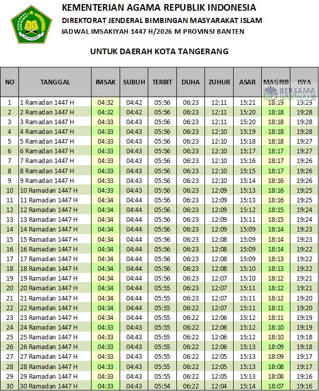 Jadwal imsakiyah Tangerang Ramadhan 2026 ini bersumber dari Website Bimas Islam milik Kementerian Agama Republik Indonesia. Untuk jadwal imsakiyah kota lainnya, bisa dibaca di Jadwal Imsakiyah Ramadhan 2026. Sedangkan yang ingin men-download atau menyimpan dalam bentuk foto, telah tersedia format jpg di atas.